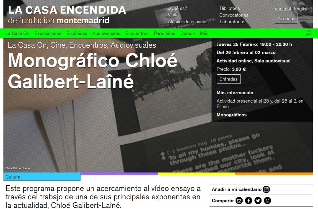 Chloé Galibert-Laîné’s video essays Flânerie 2.0, Watching the Pain of Others and Forensickness will screen as part of the „Monográfico“ screening series at La Casa Encendida in Madrid, Spain.