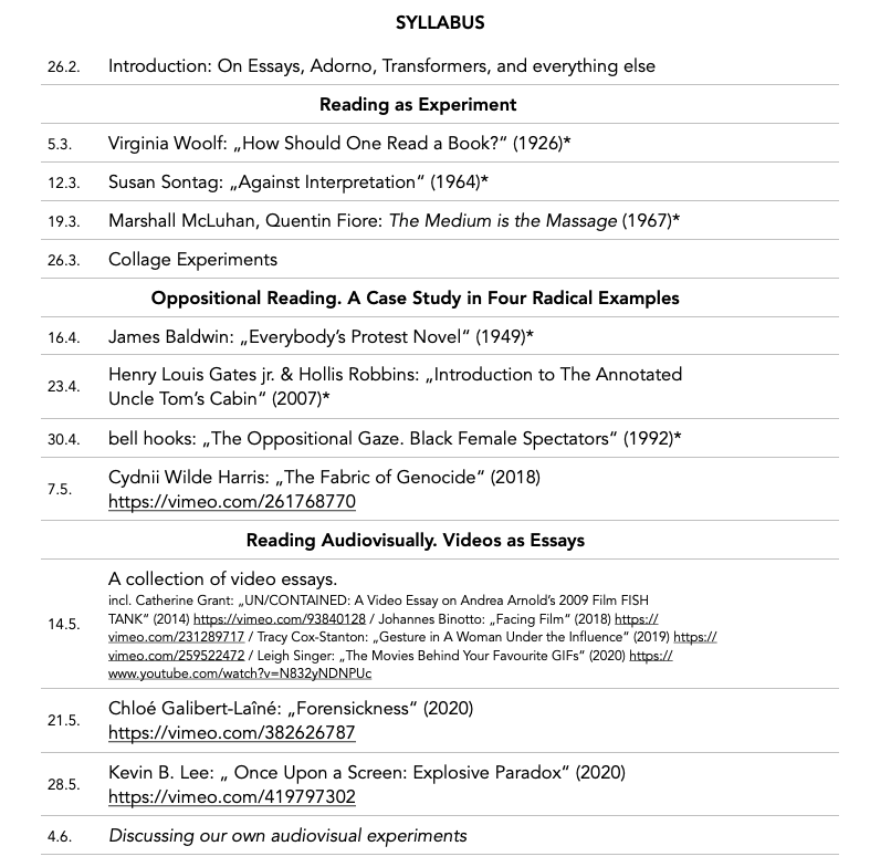 In this seminar we want to look at both current key exponents of online audiovisual research such as Catherine Grant or Kevin B. Lee as well as putting them in relation to the essayistic texts by key proponents of the form such as Virginia Woolf, James Baldwin, or Susan Sontag. We want to find out how by experimenting with different media, by thinking and playing with them, not only these authors but also we as students and teachers find new ways to analyze and to engage with literary and audiovisual texts. It goes without saying that this course, focused so much on the essayistic as experiment, will also entail experiments of our own with hands-on-exercises in how to make audiovisual essays.